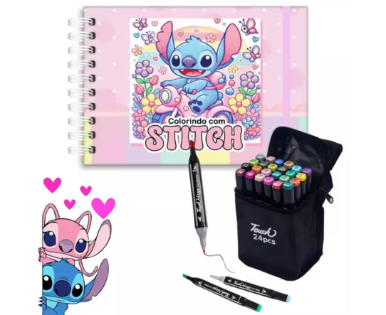 Kit Livro de Colorir Stitch + 24 Canetas Marcador Ponta Dupla, Capa Dura, 50 Pag